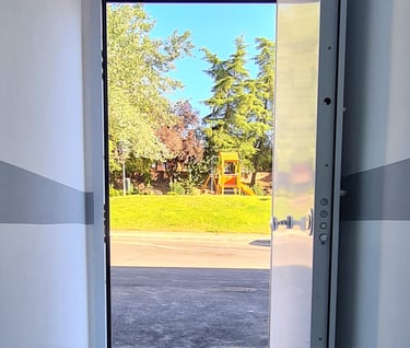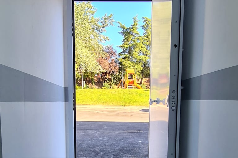 Puertas de entrada blindadas y acorazadas con cerradura de seguridad de tres puntos, con llaves y digital. Puertas de trasteros metálicas con rejillas de ventilación.
